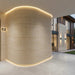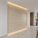 The panels create a clean, modern aesthetic with travertine and earthy tones.